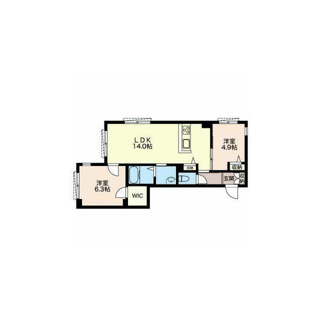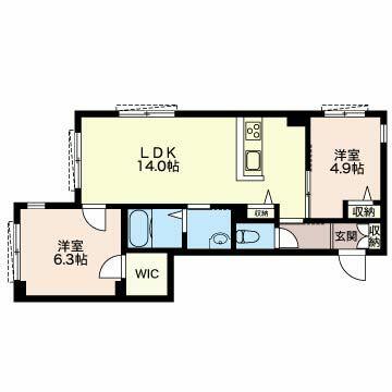 | 間取り | 2LDK(LDK14.0帖 洋室6.3帖 洋室4.9帖) | 主要採光面 | 南西 |